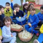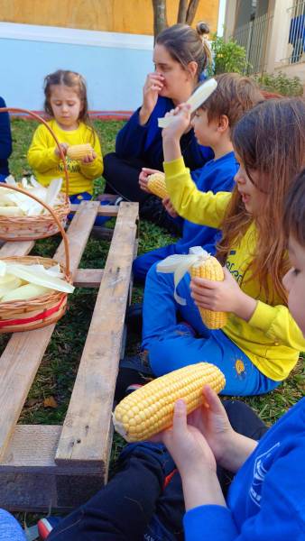 Uma das nossas propostas foi a atividade de descascar milho com os alunos, que uniu desenvolvimento motor, interação social e educação alimentar.
