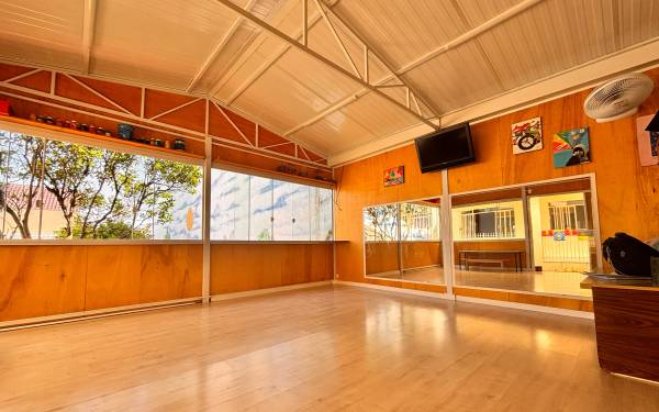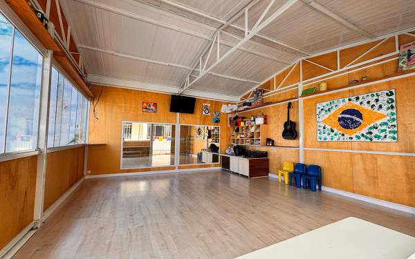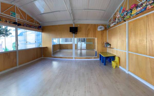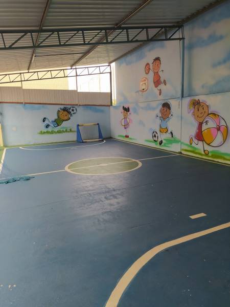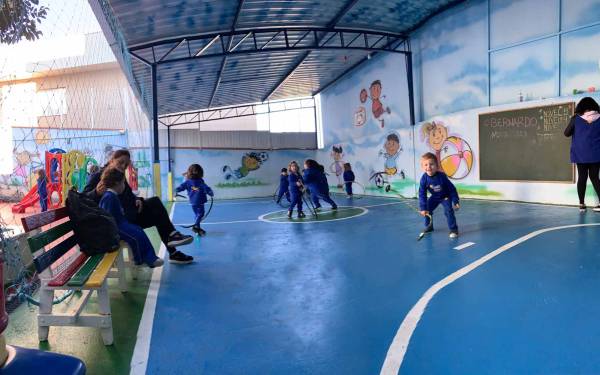 Cancha coberta para os dias de muito sol ou chuva, para as crianças desfrutarem de atividades externas sem preocupação.