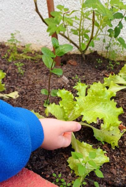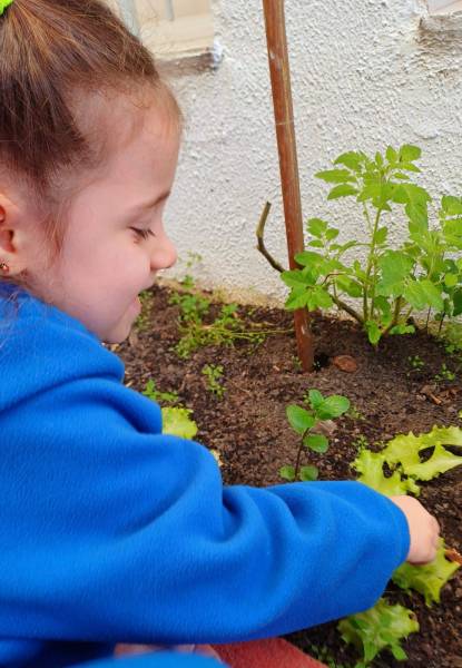 As crianças tocaram as folhas, observaram o tamanho e a coloração, sentiram a textura da terra e o cheiro das plantas frescas. Entre uma interação e outra, conversaram com os colegas e professores sobre o que estavam vendo e fazendo, demonstrando atenção e encantamento com a horta.