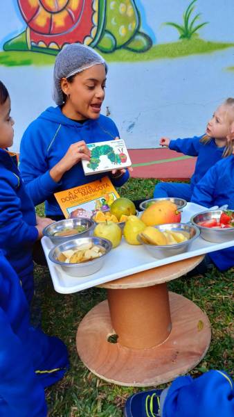 As experiências alimentares também fazem parte do processo educativo. A degustação de frutas é uma das atividades que introduz as crianças a diferentes sabores, aromas e texturas, promovendo a curiosidade alimentar e o contato com opções nutritivas desde cedo.